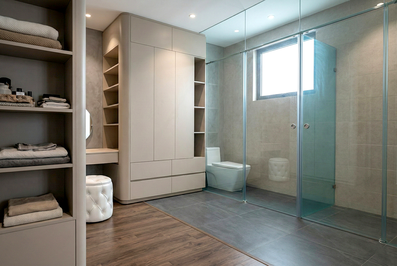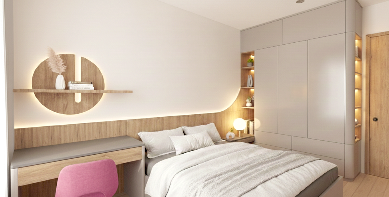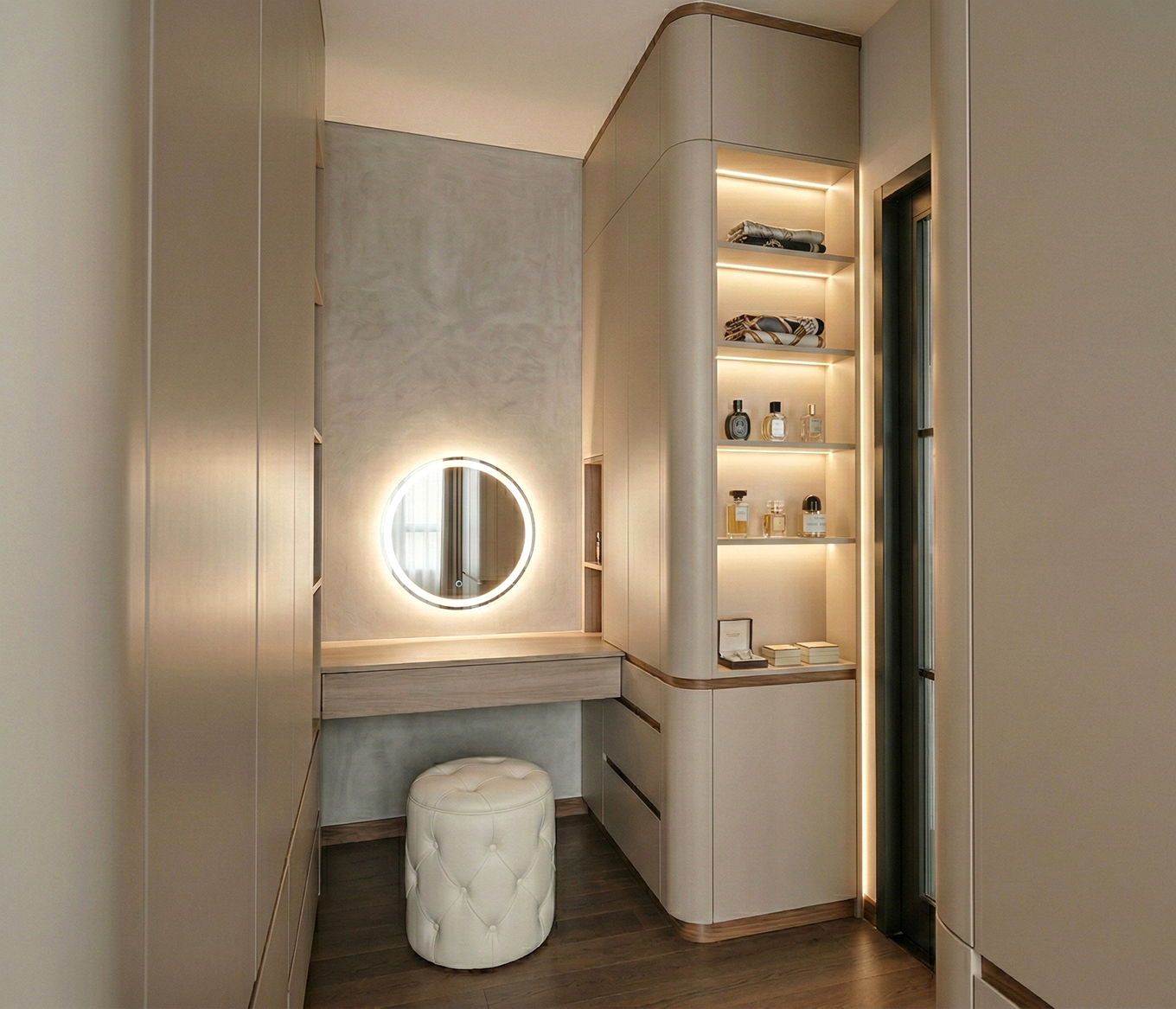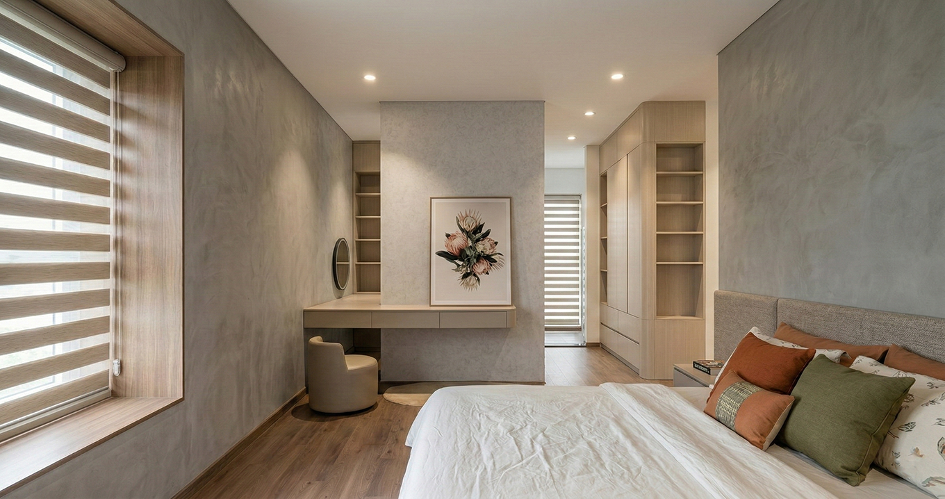 Điểm nhấn chính của dự án là việc mở rộng phòng ngủ master, tích hợp khu vực tủ đồ rộng rãi với khả năng tiếp cận thuận tiện và cảm giác sử dụng cao cấp. Không gian này được xử lý như một phần mở rộng của phòng ngủ, nơi yếu tố lưu trữ không chỉ đáp ứng công năng mà còn góp phần định hình trải nghiệm sống riêng tư và tinh tế.